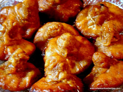 The floor must be very finely sieved. Put it into a ball add syrup and mix well together adding a little salt and little hot water, if the batter is too thick. If not sure of the consistency it is best to fry a Kavum and see whether it is right before adding the water. Keep ready a deep found-bottom pan of boiling coconut or vegetable oil. Pour spoonful of the batter and as it begins to fry and the centre rises pour in a little more batter into the centre and insert an ekel in the middle of the fritter, not allowing it to go through. Keep twisting the ekel round and round and at the same time splashing the boiling oil on the fritter using an oil spoon for the purpose. This is to produce the Konde (hair) Press round the base of the Konde with the spoon to get it in to the proper shape. The Kavum must have a nice brown colour when fried. Drain well